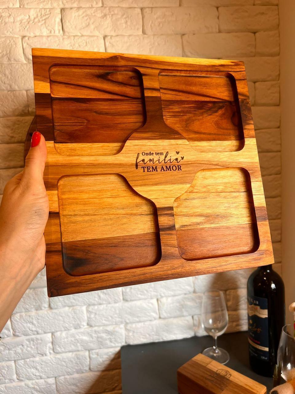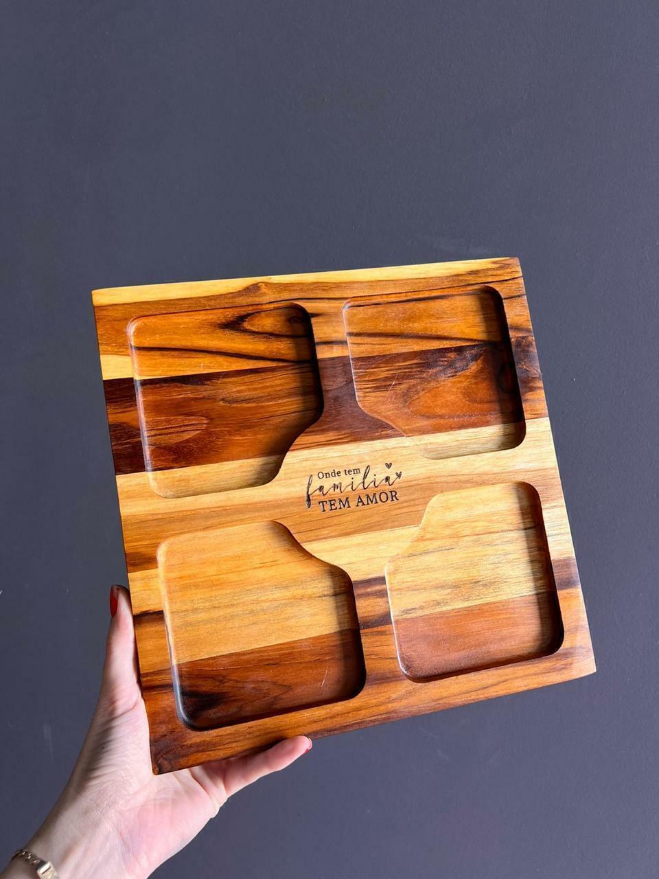 Esta peça versátil tem duas faces: uma pode ser usada como petisqueira, com rebaixes para os petiscos e uma linda área central de personalização; a outra como uma tábua de servir. Em uma edição especial de Dia dos Namorados, ela pode ser personalizada com as iniciais do casal em formato de monograma. Além disso, o verso também pode ser personalizado com uma frase que represente a essência do casal.